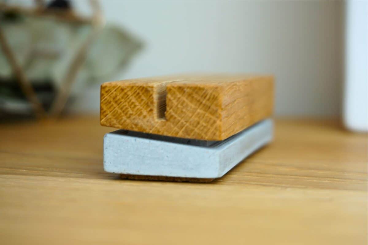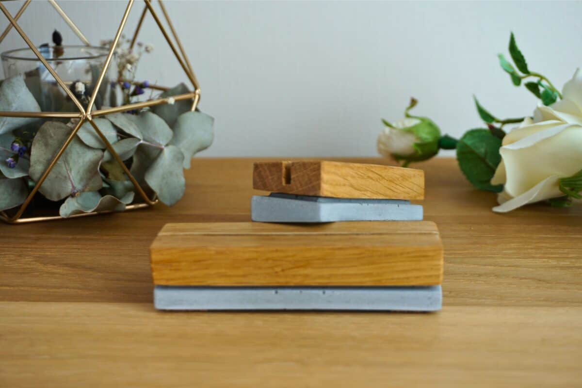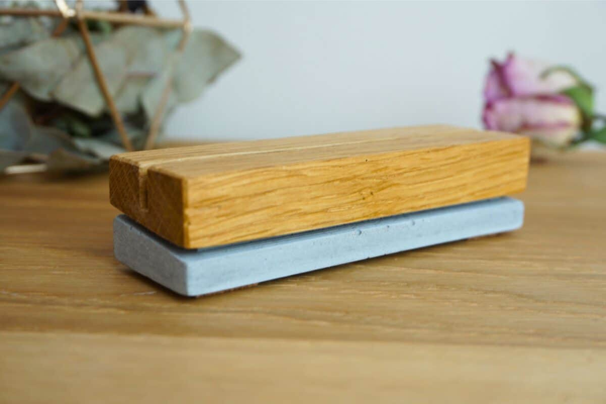– Der Kartenhalter hat eine Schräge, wodurch auf der einen Seite mehr Holz und auf der anderen Seite mehr Beton sichtbar ist – je nach Vorliebe kann er entsprechend aufgestellt werden.