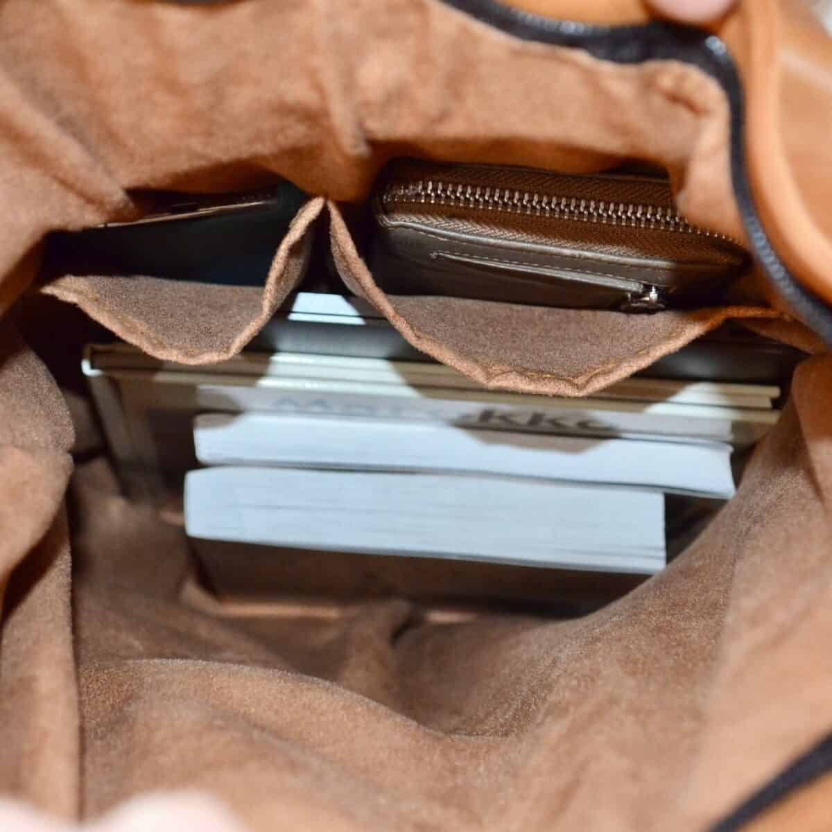 Wegen seiner Höhenverstellbarkeit ist der Rucksack ein echtes Raumwunder. Es gibt also genügend Platz, für die Dinge, die du dabei haben möchtest. Ein Laptop und ein Ordner passen problemlos rein. Im Inneren gibt es mehrere kleine Fächer, in denen dein Geldbeutel oder dein Schlüssel gut verstaut werden können. Außen auf der Rückseite hat er ein Fach mit Reißverschluss, in welches du dein Smartphone, Reisepässe oder Tickets griffbereit unterbringen kannst.