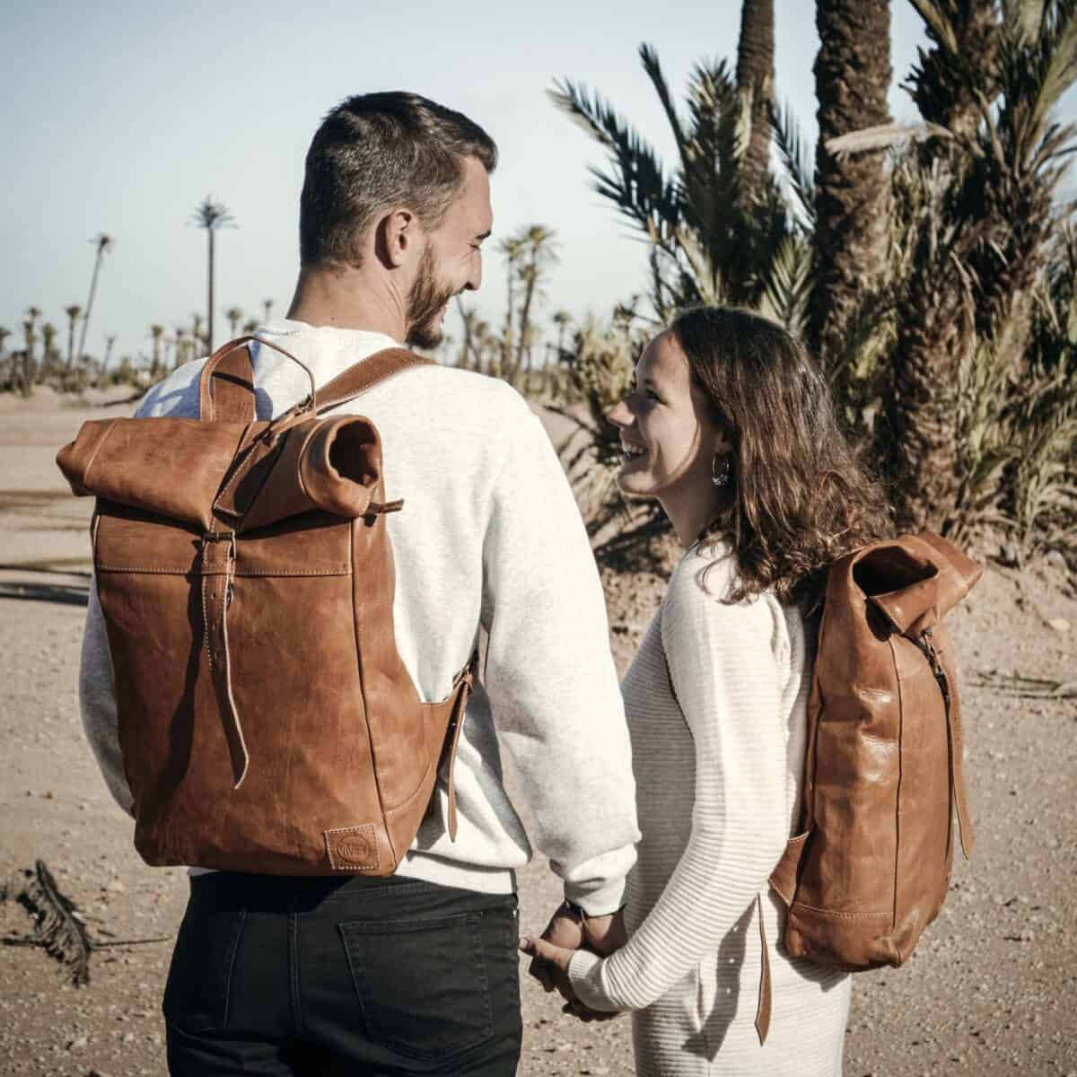 Der Rucksack wurde in Marokko handgefertigt und besteht aus Ziegenleder, welches zu 100% ohne Chemikalien verarbeitet wurde.