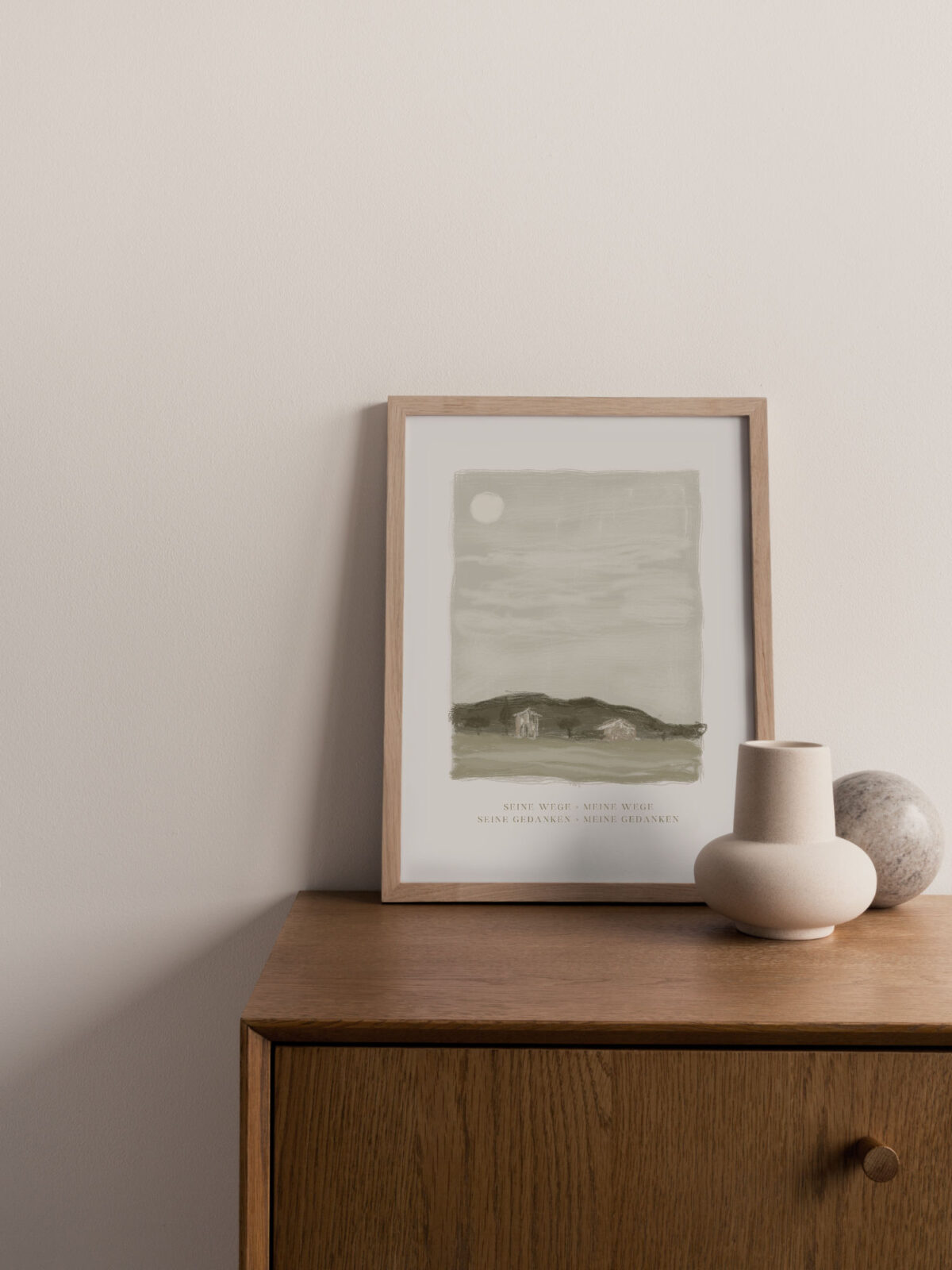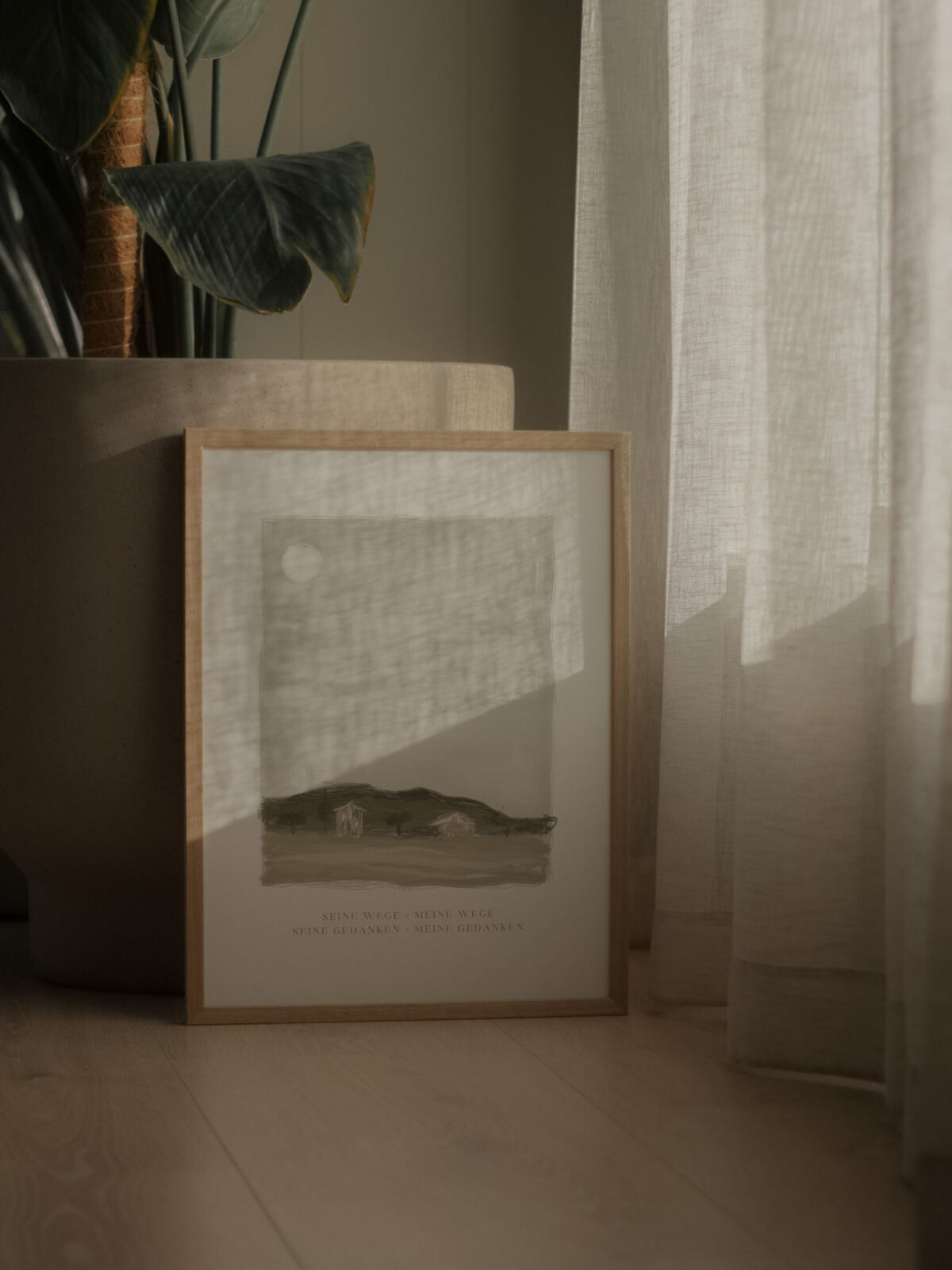 Gottes Wege und Gedanken sind so viel höher als unsere. In Jesaja 55,9 heißt es, dass der Unterschied so groß ist, wie der Himmel über der Erde ist. Auf diesem Poster habe ich drücke ich dieses Verhältnis aus. Die Häuser und die Natur wirken unbedeutend klein, wenn man seinen Blick nach oben hebt und über die Größe des Himmels staunt und über den, der ihn geschaffen hat.