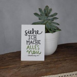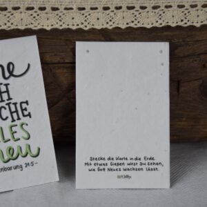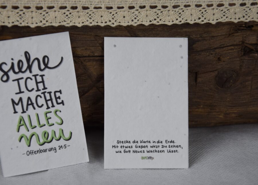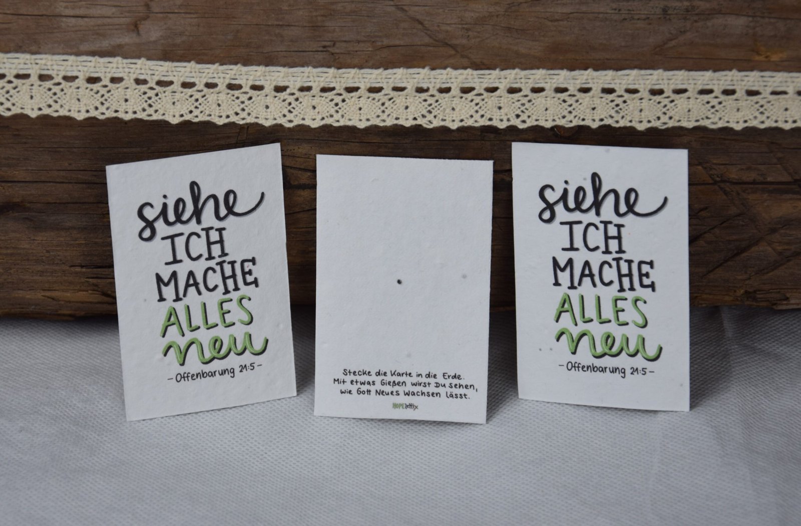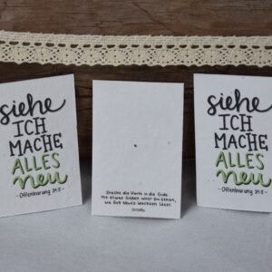 Die Minikärtchen "alles neu" sind ein besonderes Produkt. Das Papier besteht aus Samenpapier, welches in die Erde gesteckt werden kann und mit etwas Wasser anfängt zu Keimen. So wird ganz praktisch sichtbar, was der Bibelvers aus Offenbarung 21,5 verspricht.
