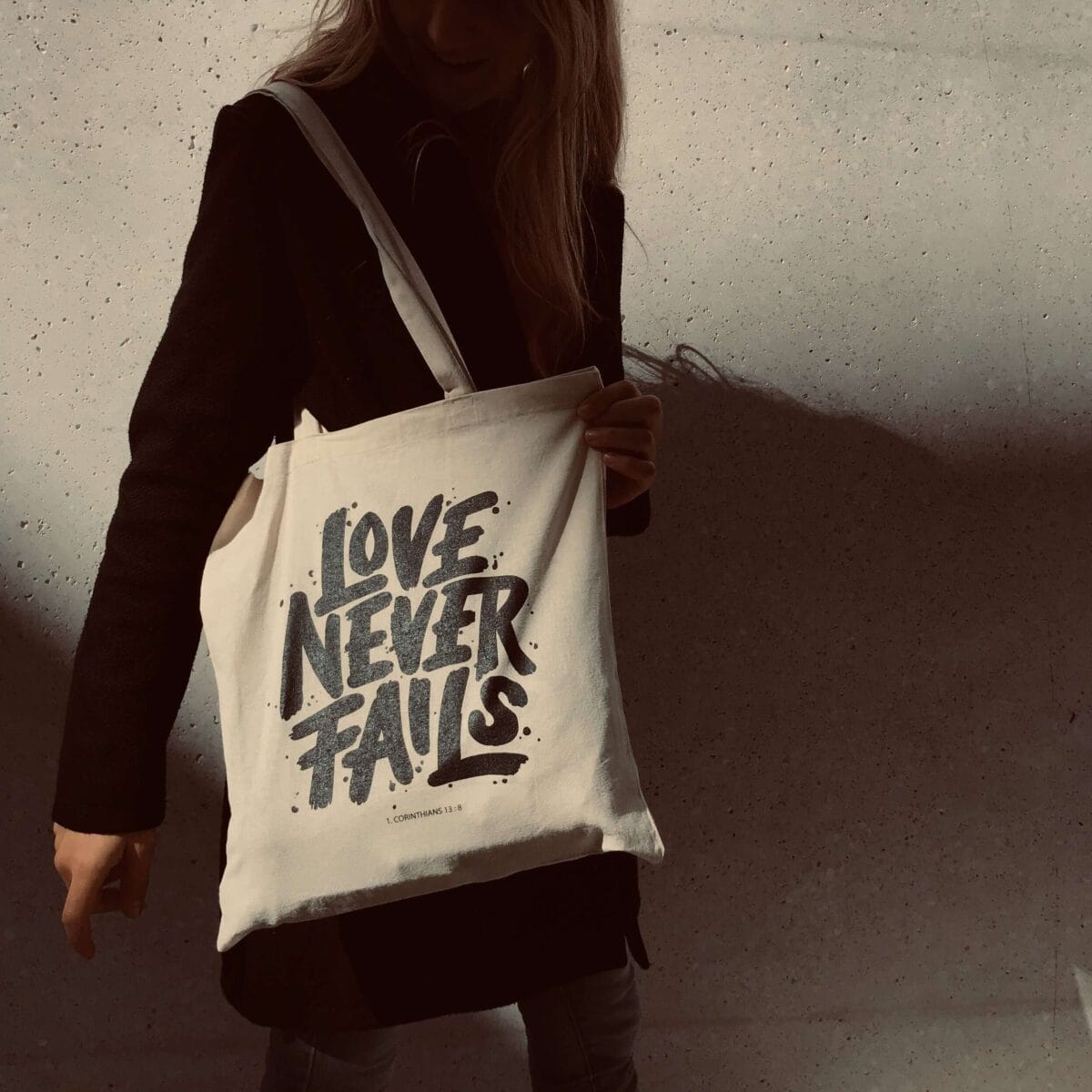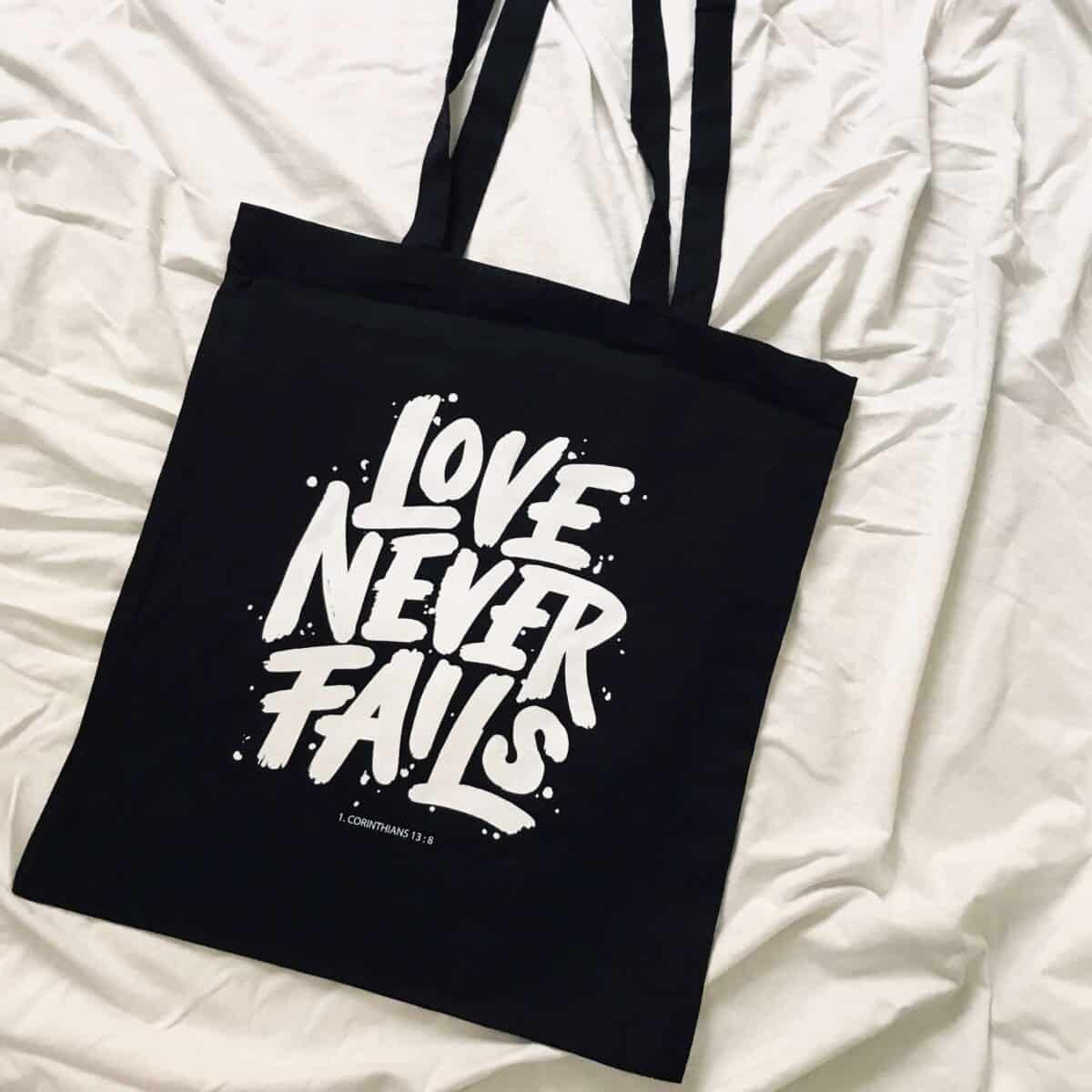Das Lettering auf dem Stoffbeutel “Lover never fails” kommt inhaltlich nach 1. Korinther 13,8 und bedeutet übersetzt