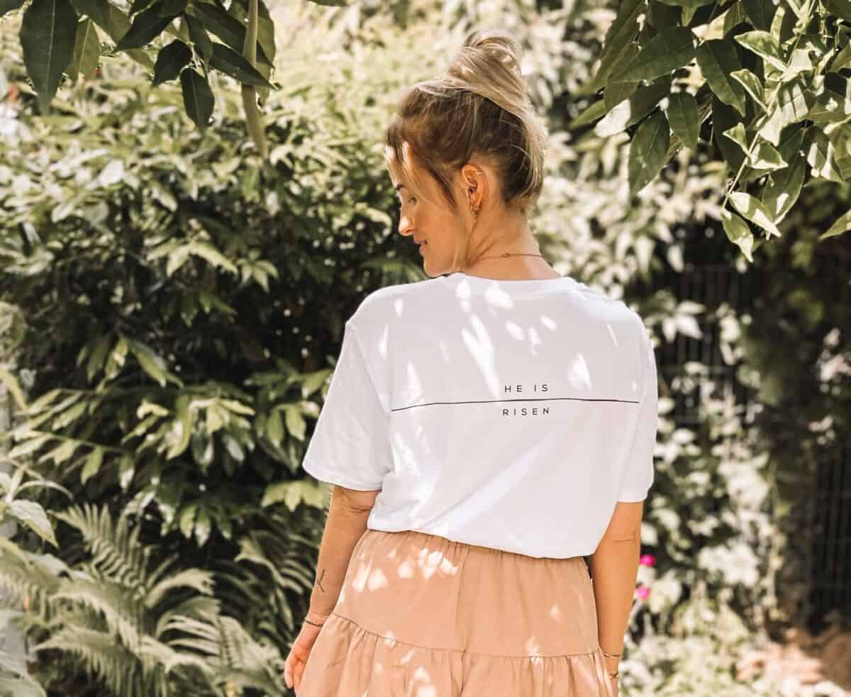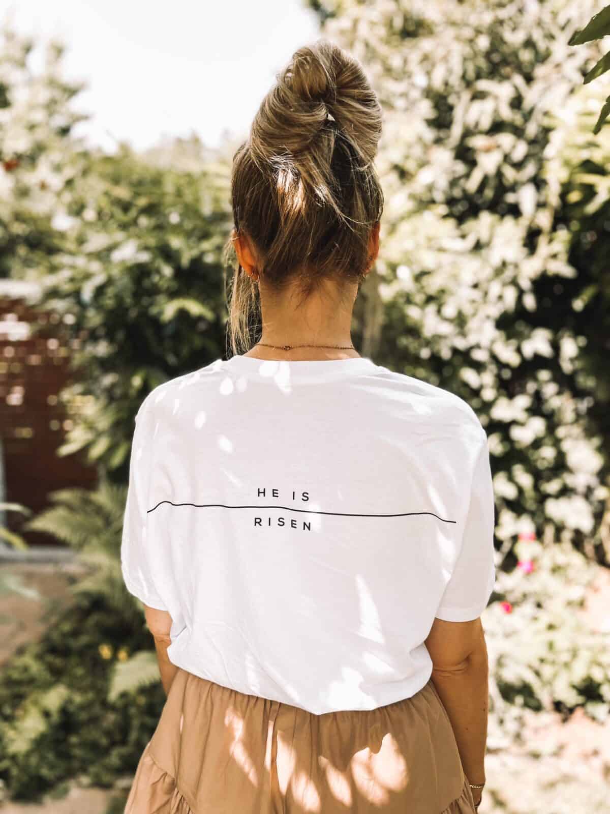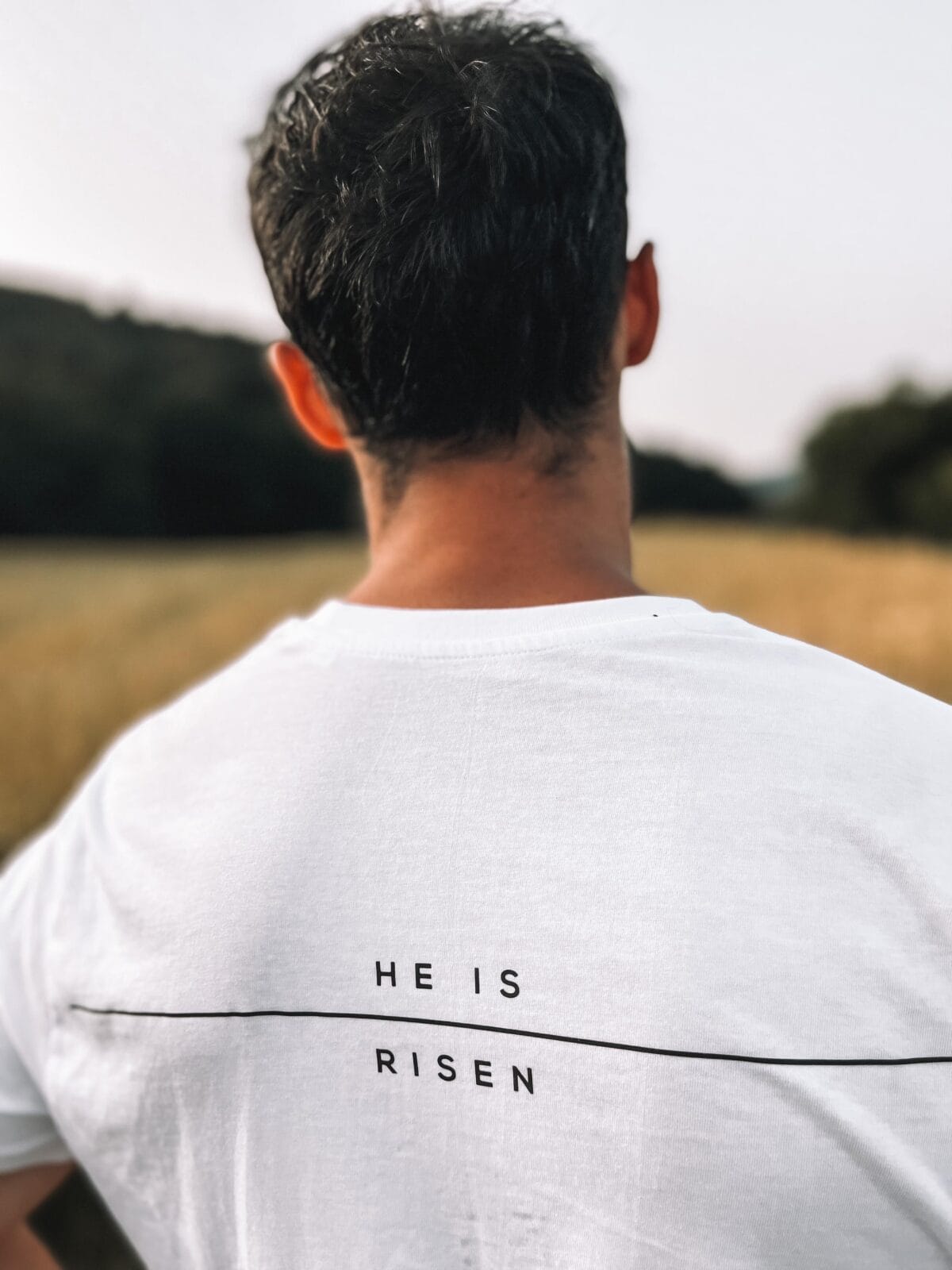 T-Shirt mit der Aufschrift „HE IS RISEN“ (ER IST AUFERSTANDEN) auf der Rückseite