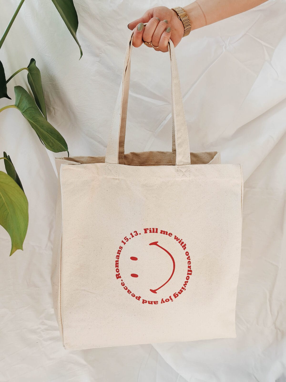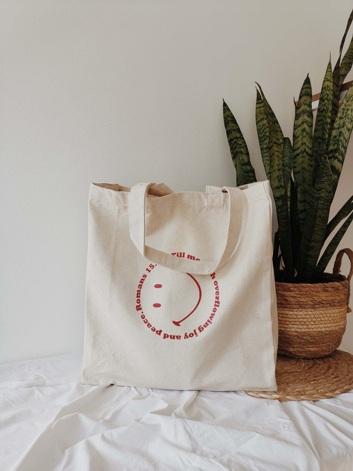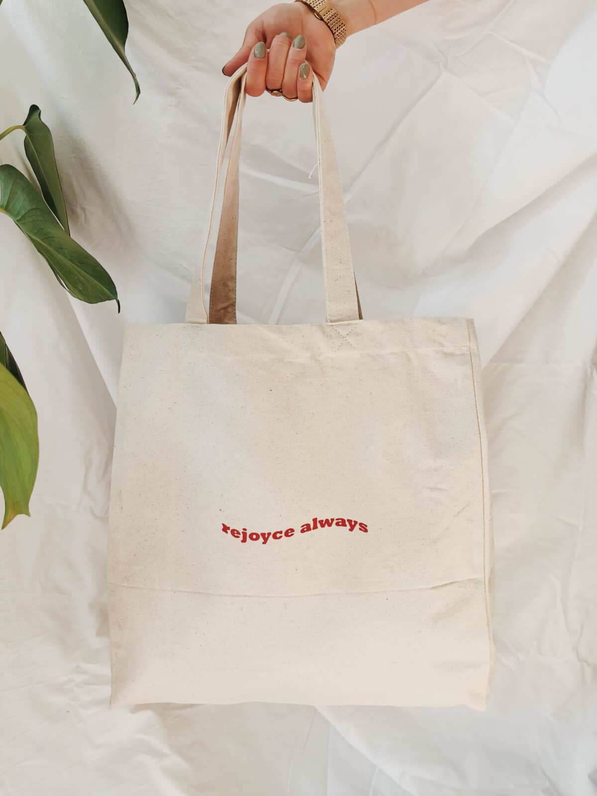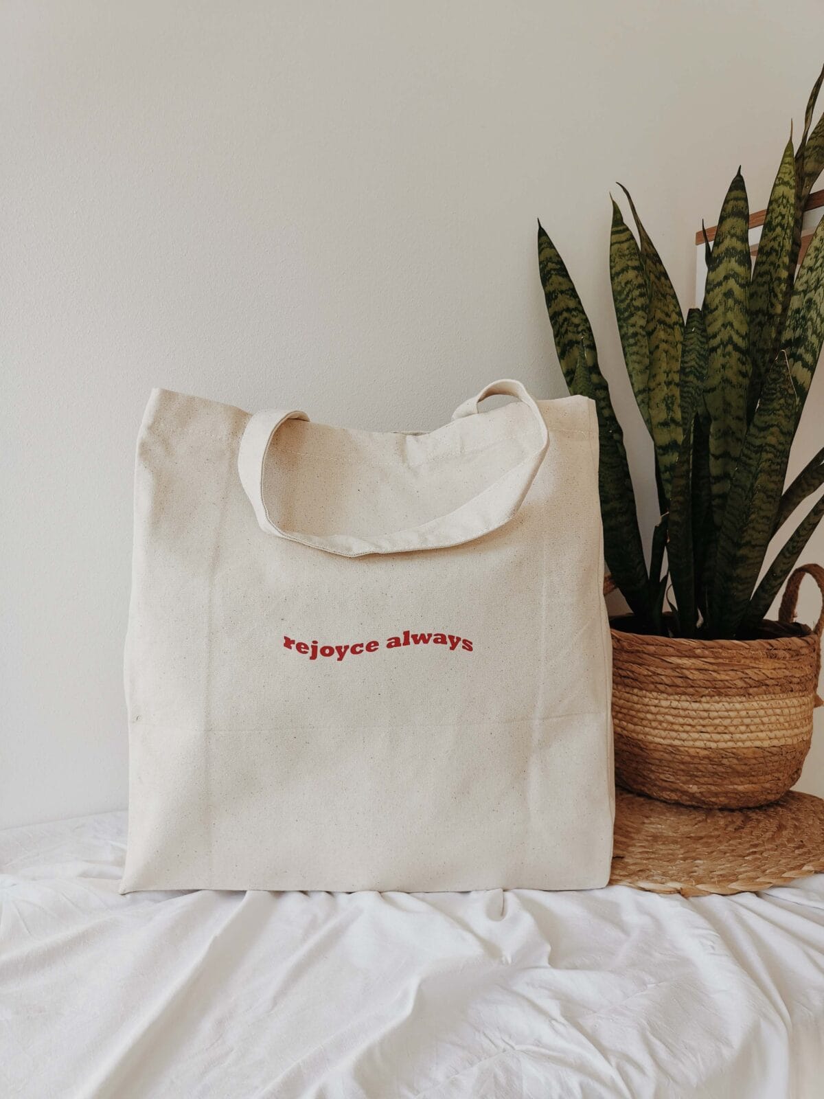 Die Bio-Baumwolltasche ist mit dem Spruch aus Römer 15,13 bedruckt: Rejoyce always!