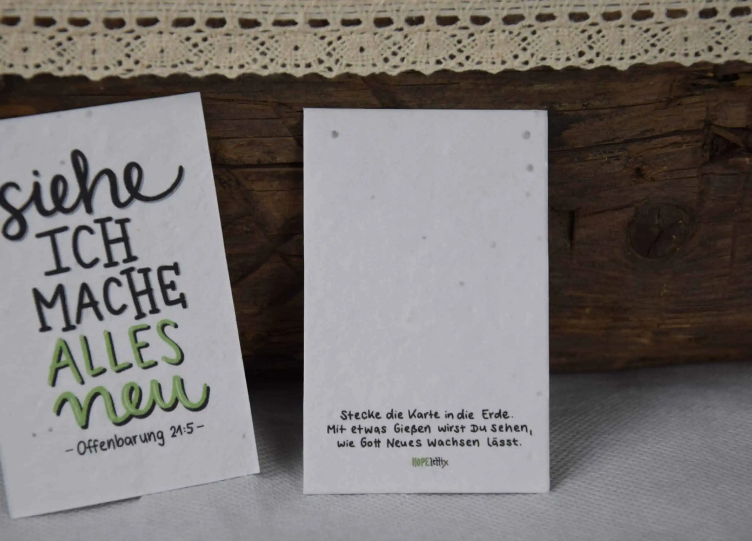 Die Minikärtchen “alles neu” sind ein besonderes Produkt. Das Papier besteht aus Samenpapier, welches in die Erde gesteckt werden kann und mit etwas Wasser anfängt zu Keimen. So wird ganz praktisch sichtbar, was der Bibelvers aus Offenbarung 21,5 verspricht.