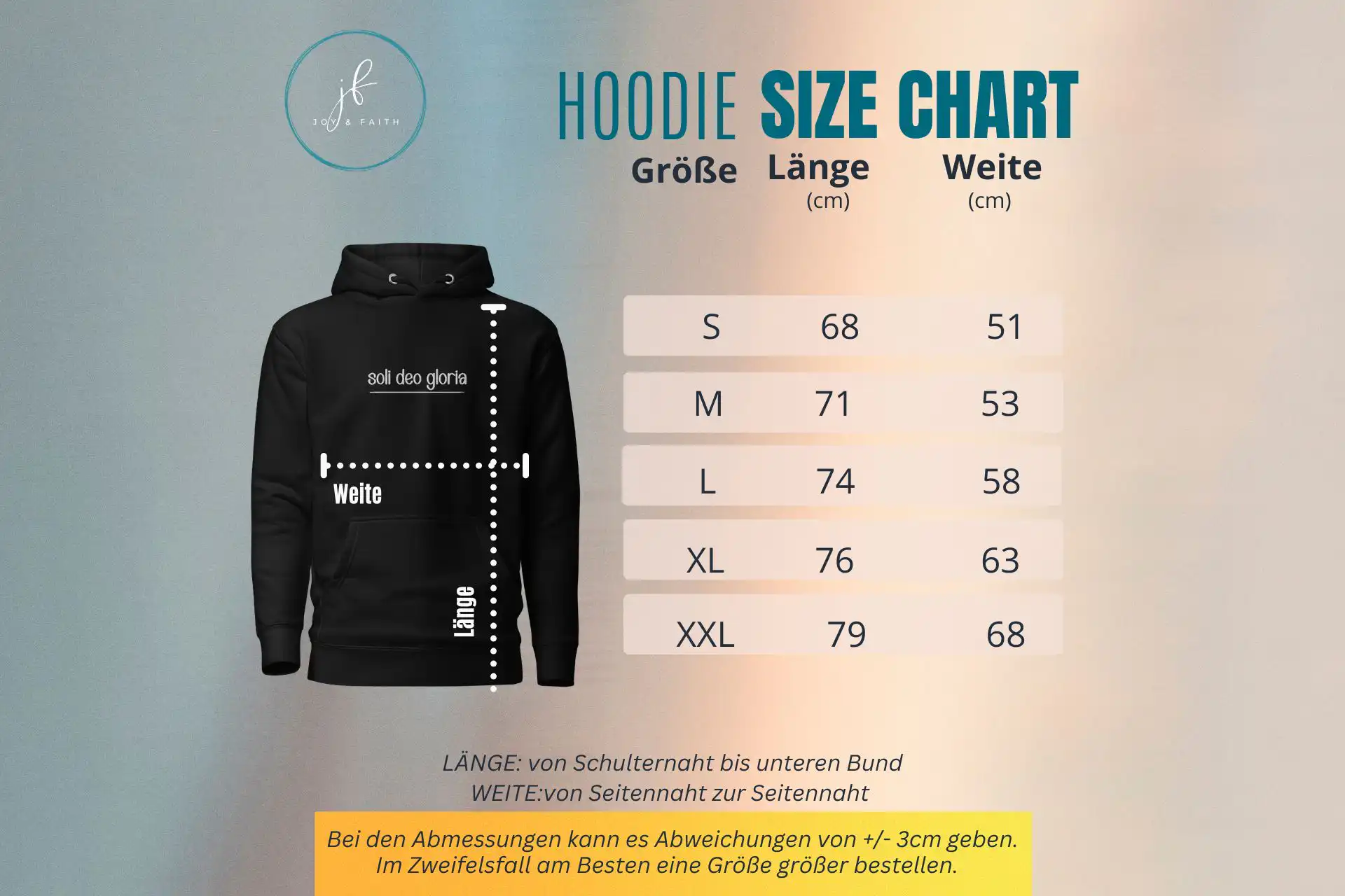 Bitte wirf einen Blick in die Größentabelle und miss im Zweifel nach, damit dein Hoodie perfekt sitzt.