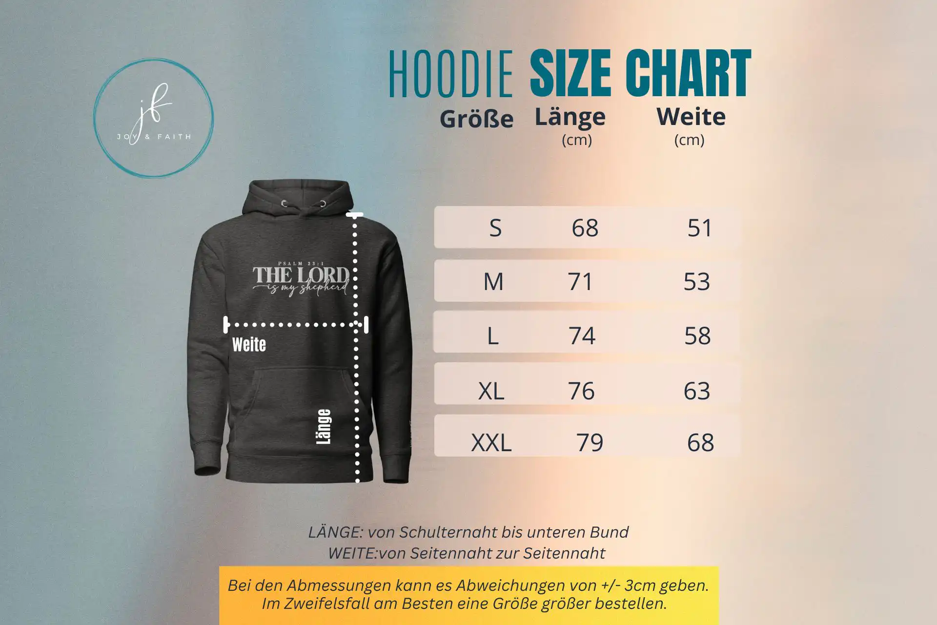 Bitte wirf einen Blick in die Größentabelle und miss im Zweifel nach, damit dein Hoodie perfekt sitzt.