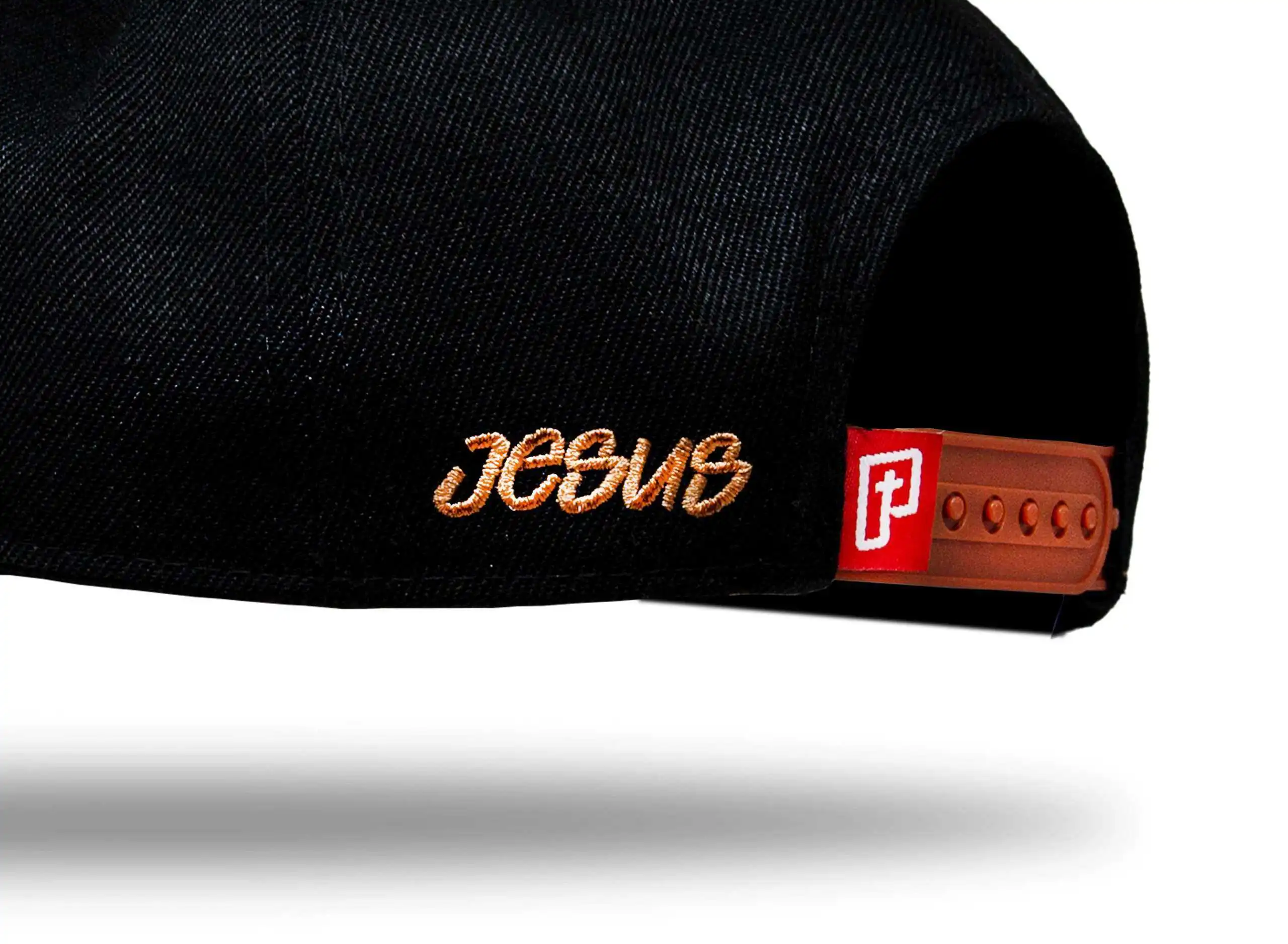 und einem 2D Druck hinten links “Jesus”, mit einem Snapbackverschluss, gefertigt aus Acryl