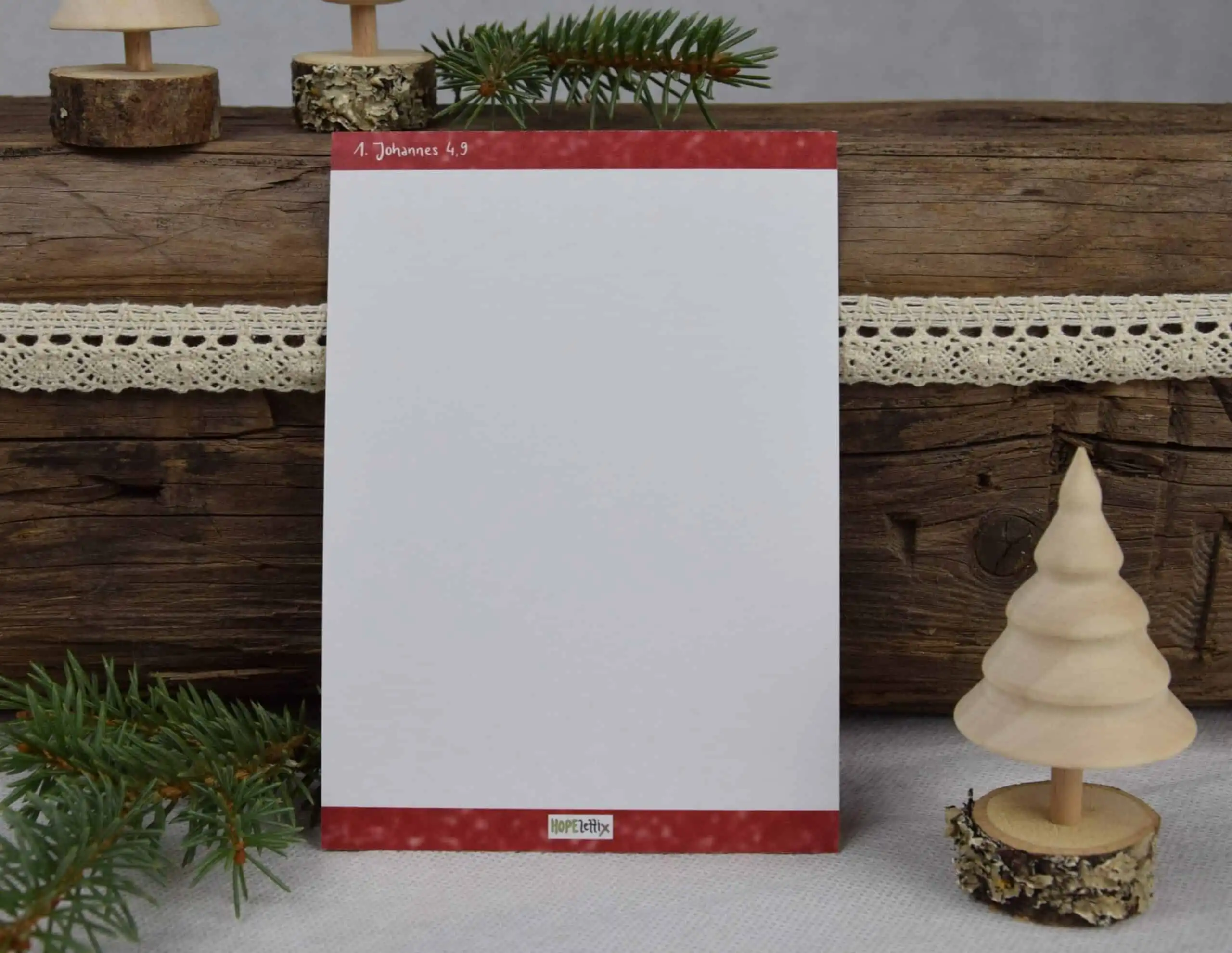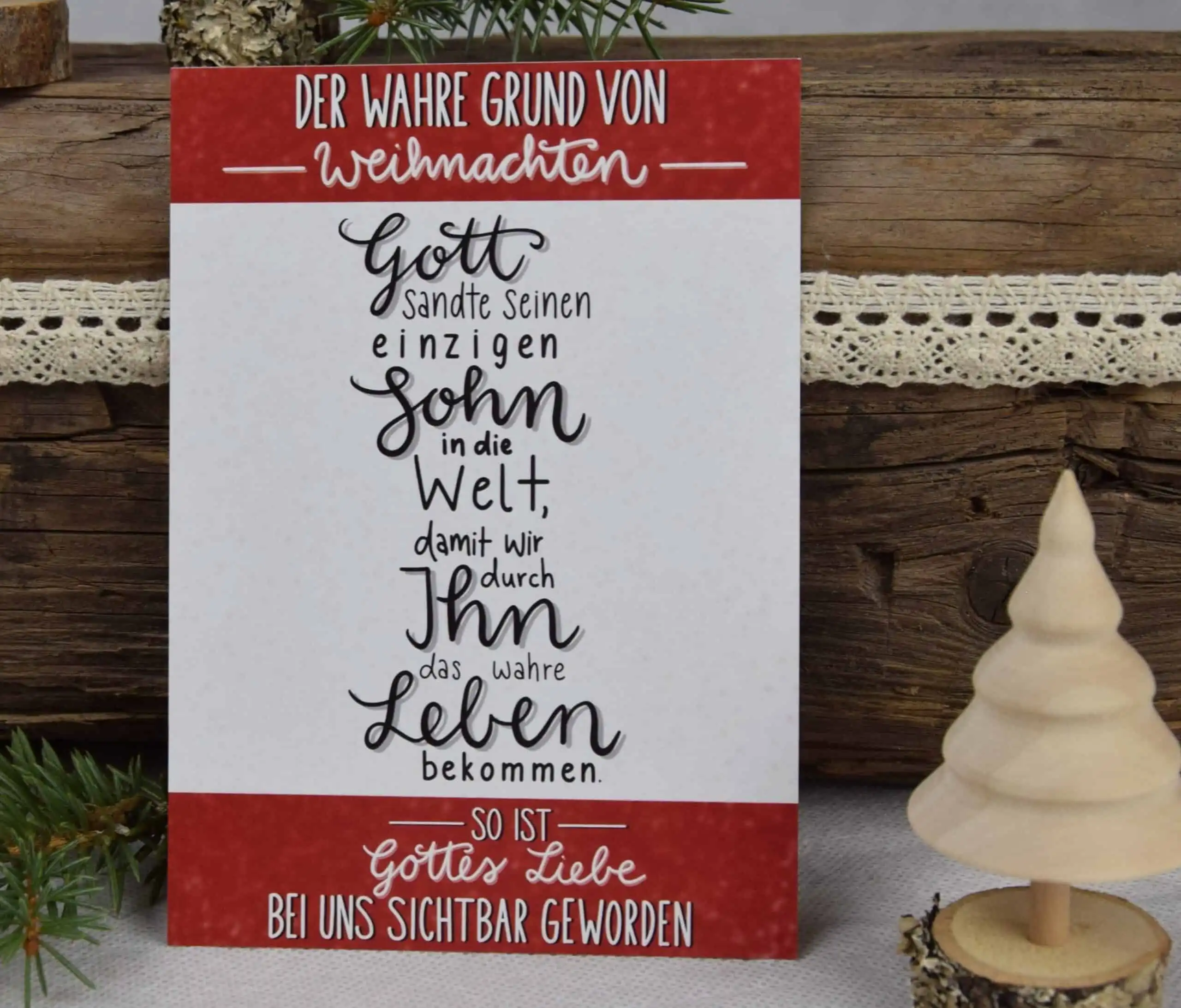 Die Weihnachtskarte “wahre Grund von Weihnachten” bringt mit dem schlichten Design die zentrale biblische Botschaft auf den Punkt. Nach der Bibelstelle 1.Johannes 4,9 wurde die Grußkarte im Handletteringstil gestaltet.